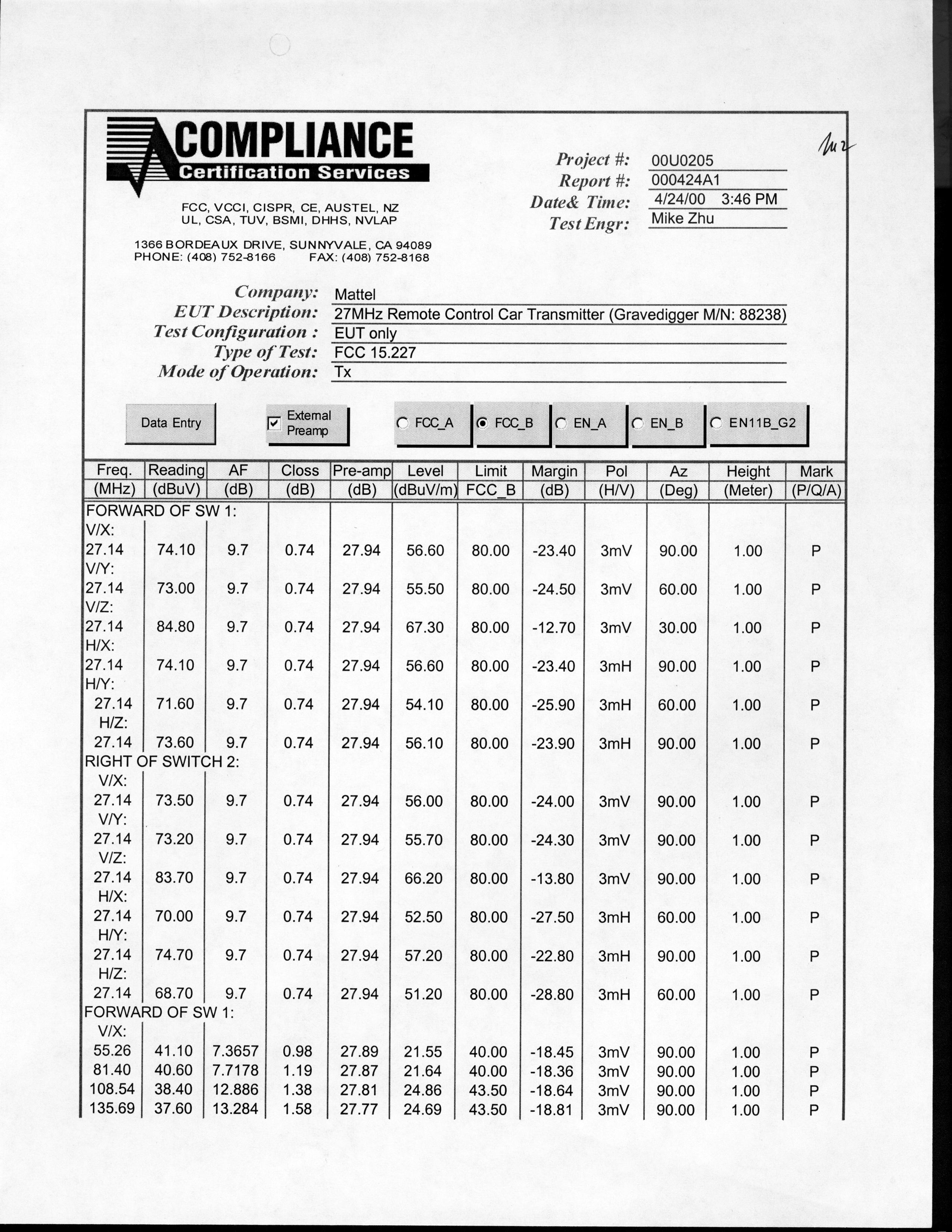 | Test Firm Contact | Steve Cheng |