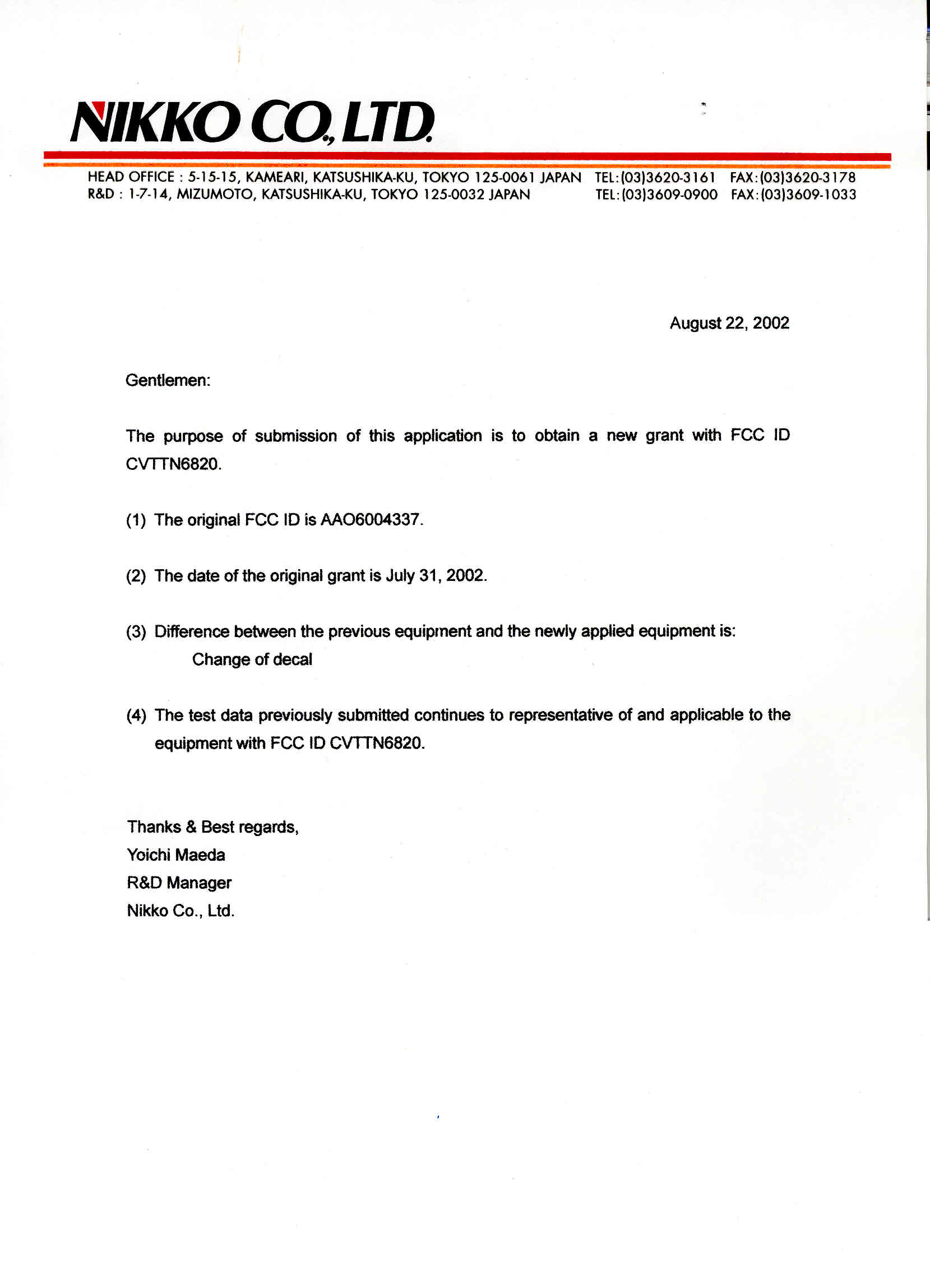 | Certified By | Yoichi Maeda – Manager |