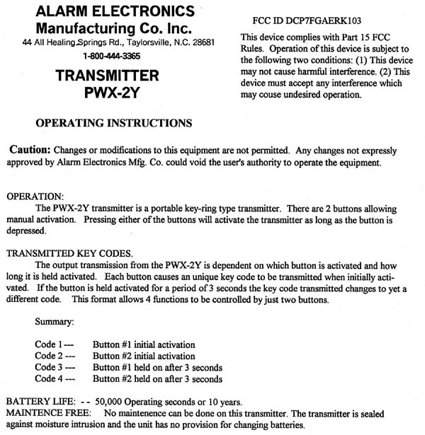 | Equipment | Key Code Security Alarm TX |