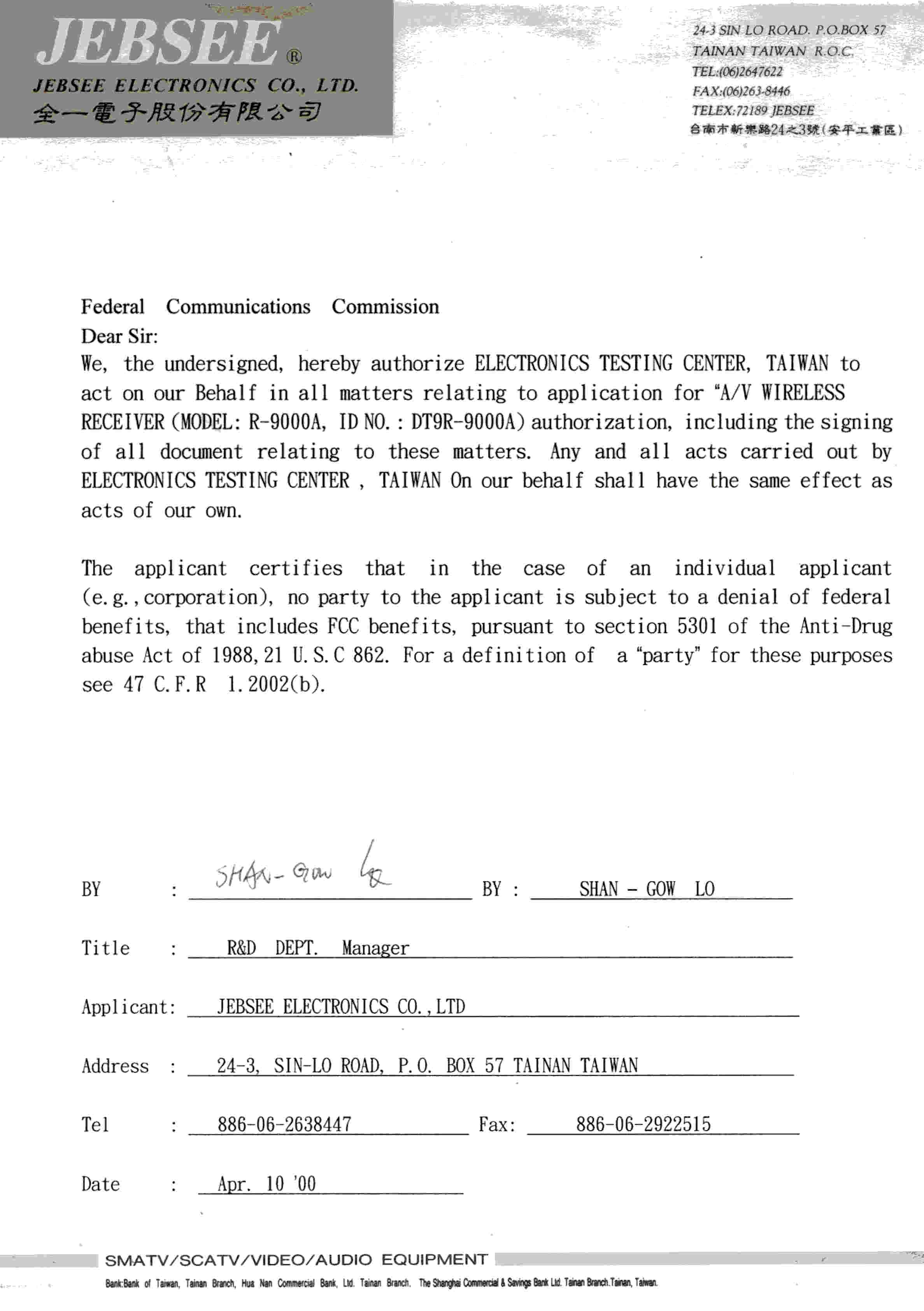 | Applicant Fax | 886 6 2922515 |