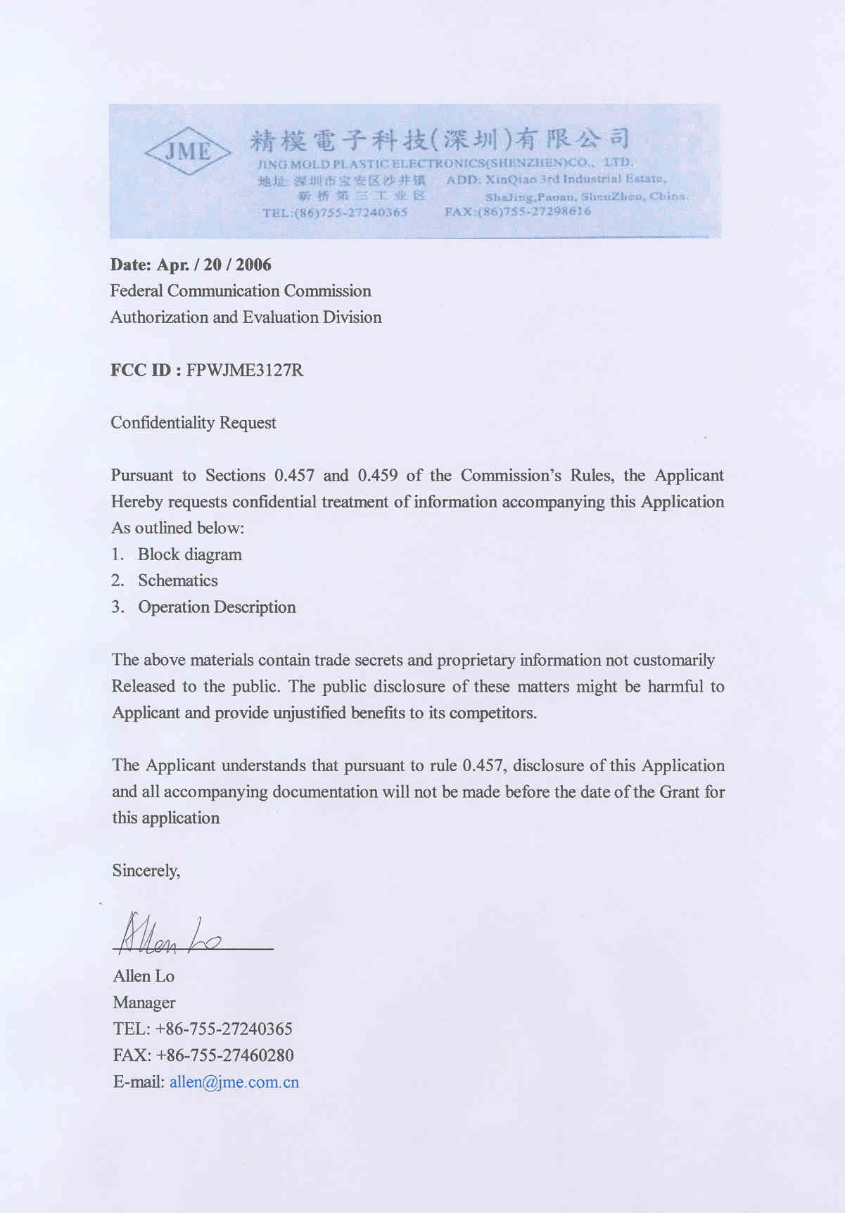| Certified By | Allen Lo – Manager Leader, Jing Mold Electronics Technology |