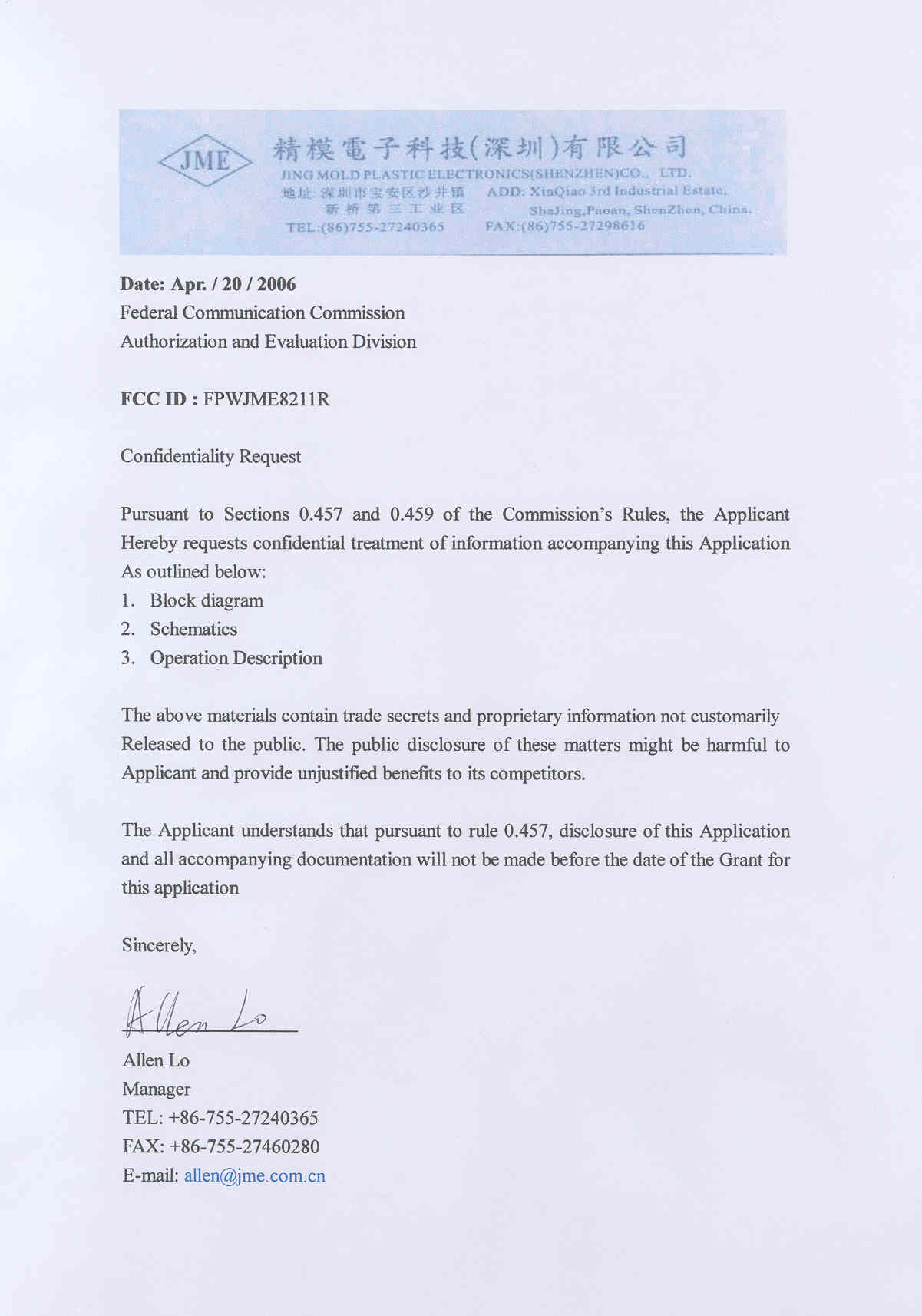 | Certified By | Allen Lo – Manager Leader, Jing Mold Electronics Technology |