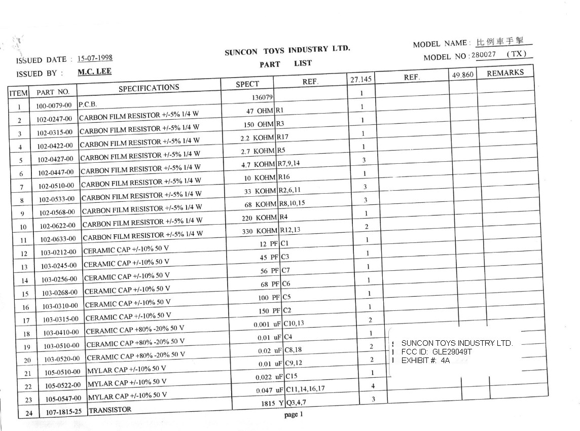 PARTS LIST PAGE ONE