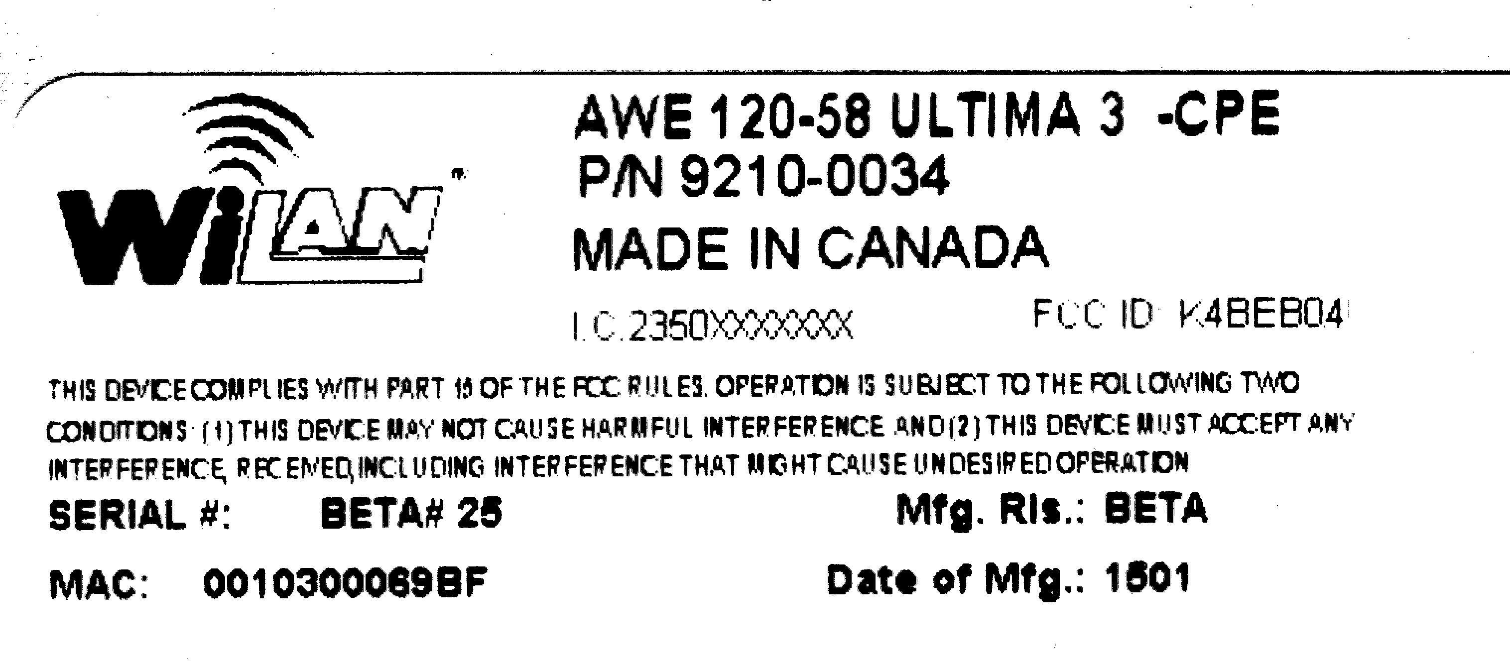 | Equipment | Wireless Ethernet Bridge, AWE 120-58 MKIII |