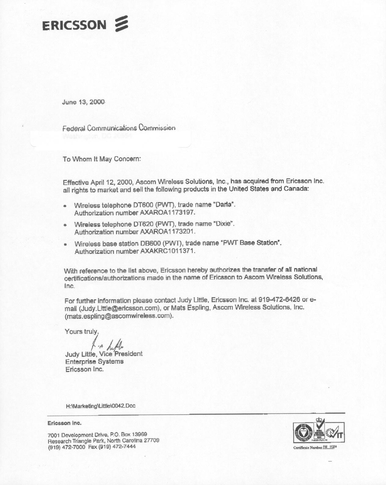 Amended format for Authorization from Ericsson Letter