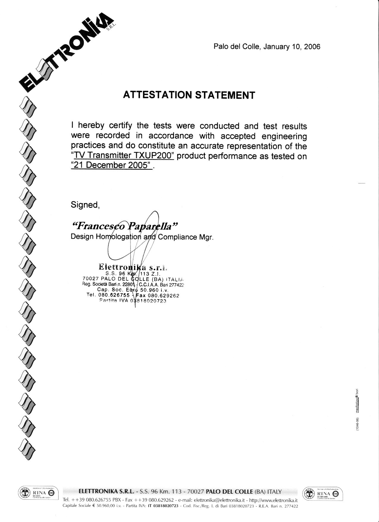 | Certified By | Francesco Paparella – Design Homologation Manager |