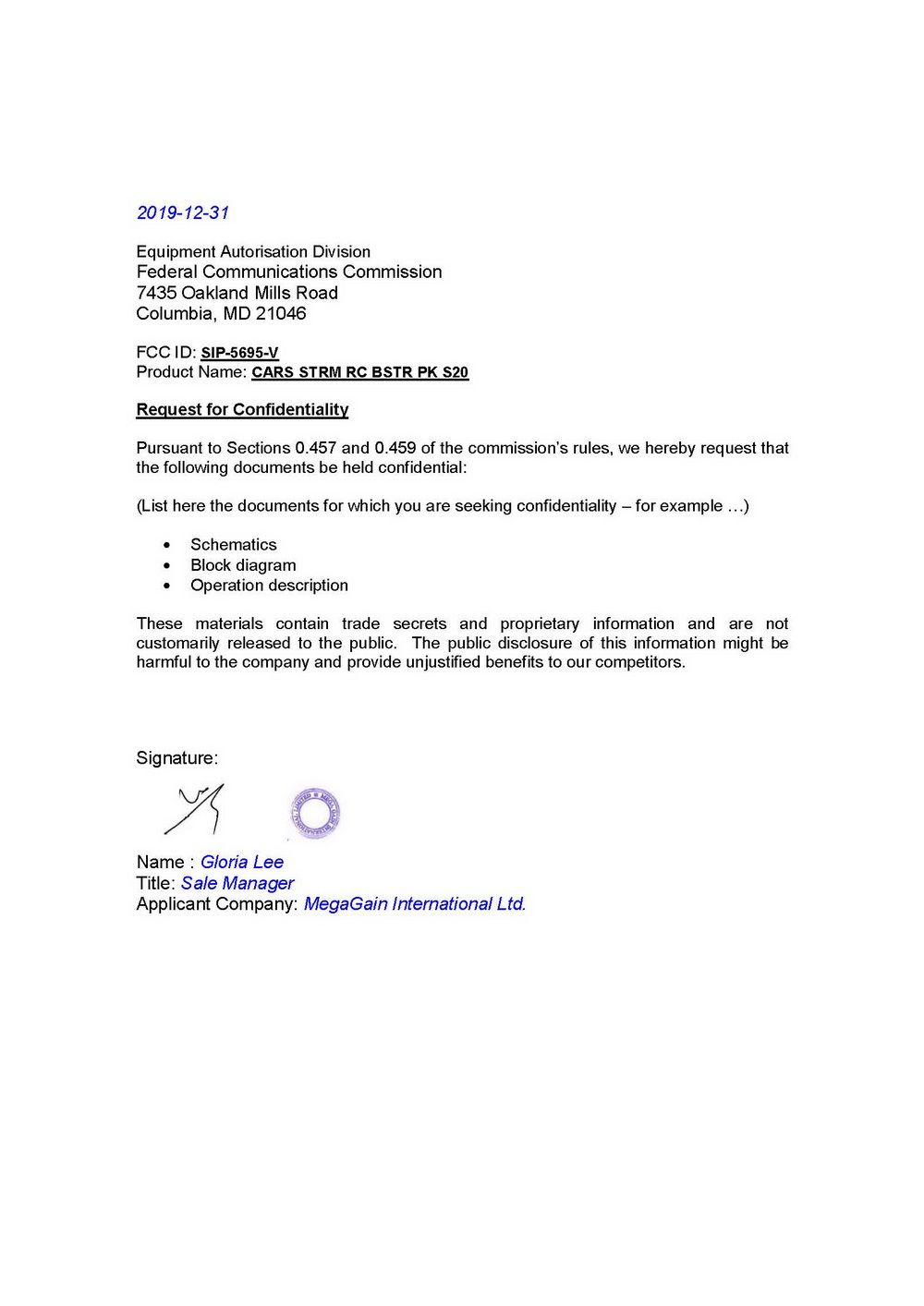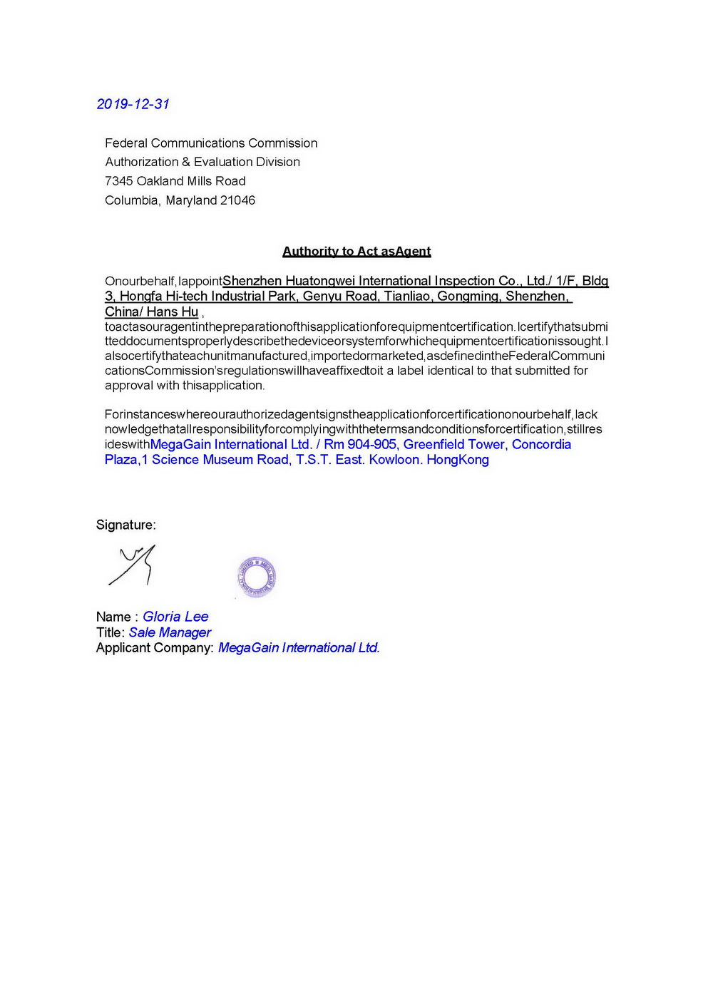 | Applicant | Gloria Lee – Sales Manager |